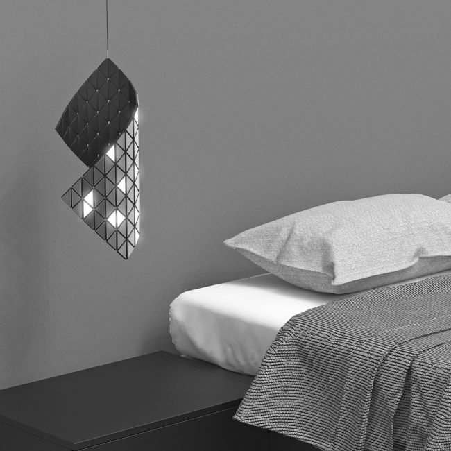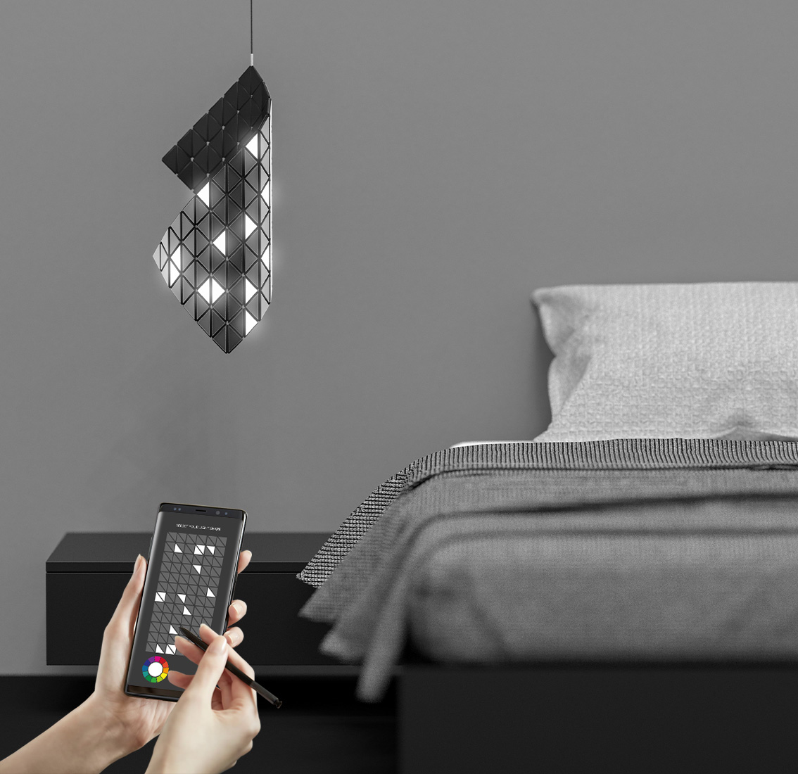 This modular lighting system features triangular panels with conductive magnetic connections, offering creative flexibility and effortless reconfiguration. Users can shape, color, and control the panels via a mobile app, creating an immersive, customizable lighting experience for walls, ceilings, or bedside settings.